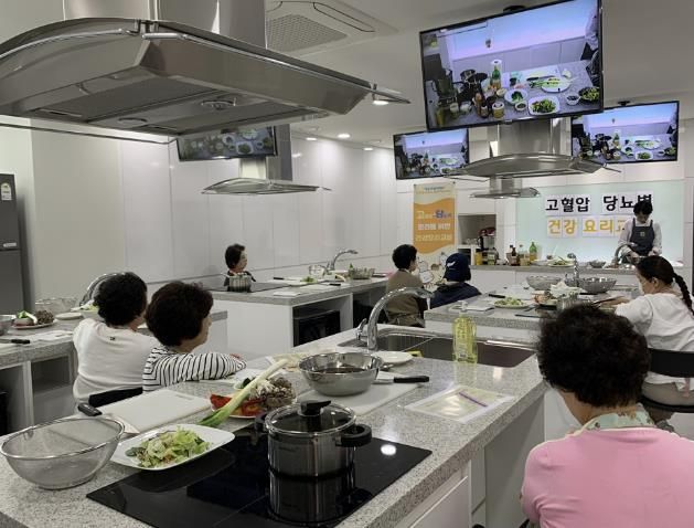 이날 참여자들은 안전사고 예방 교육을 받은 뒤 2시간 동안 4조(조별 2명)로 나뉘어 실습을 진행했다. 참여자들은 정인영 교수의 요리 시연을 감상한 후 직접 재료를 다듬고 조리해 고혈압·당뇨병 맞춤형 요리인 ‘콩비지 찌개’와 ‘채소 들깨소스 무침’ 완성했다.