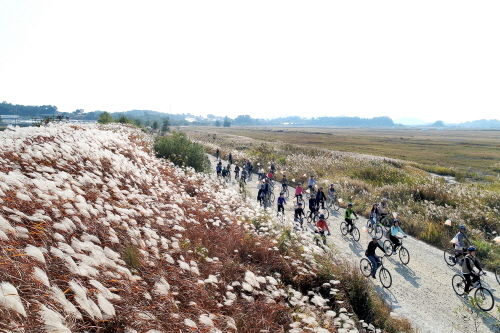 오전의 문학특강과 당성(마산포) 답사를 마치고, 오후에는 전국에서 찾아온 참가자들과 함께 어섬에서 시화호 남단을 가로지르는 라이딩을 시작하였다. 김연수 작가와 참가자들은 자전거를 타고 어섬을 출발하여 시화호 남단까지 총 10.5km의 숨은 비경을 만끽하였다.
