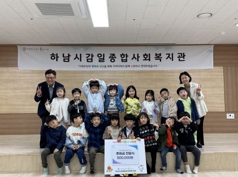 (중부시사신문) 하남시감일종합사회복지관(사회복지법인 휴먼복지회 운영)에서 시립감일리틀포레어린이집과 함께 지난 10월 28일 후원금 전달식을 가졌다.