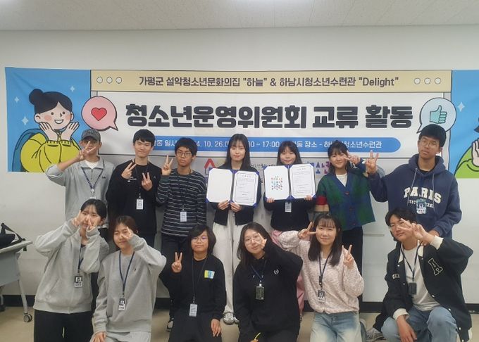 (중부시사신문) 가평군 설악청소년문화의집은 최근 청소년운영위원회 ‘하늘’과 하남시청소년수련관 청소년운영위원회 ‘Delight(딜라이트)’가 교류 활동을 진행했다고 밝혔다.