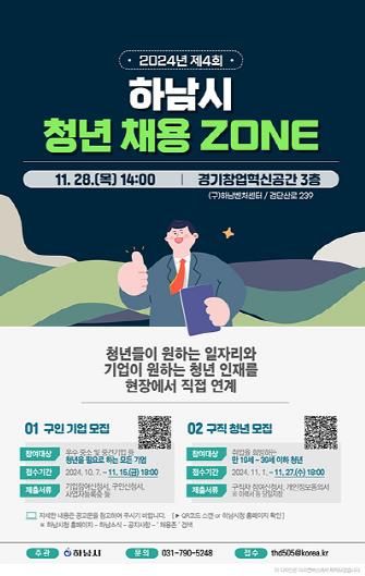 (중부시사신문) 하남시가 오는 28일 오후 2시부터 경기창업혁신공간 동부권역 하남(하남시 검단산로 239)에서 ‘2024년 제4회 하남시 청년 채용존(ZONE)’에 참여할 기업과 청년을 모집한다.