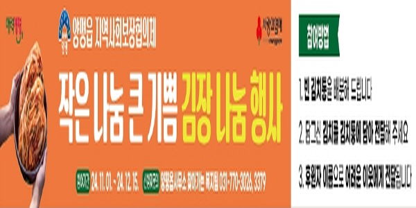 (중부시사신문) 양평군 양평읍 찾아가는 복지팀과 양평읍지역사회보장협의체는 복지사각지대에 놓인 이웃들이 겨울철 먹거리 부담을 덜 수 있도록 ‘작은 나눔 큰 기쁨 김장 나눔 행사’ 사업을 이달 1일부터 내달 15일까지 추진한다.