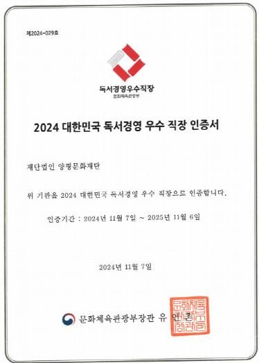 양평문화재단은 이번 인증으로 도서 기증을 받게 되어, 양평생활문화센터 내 도서를 비치하는 등 앞으로도 지속 가능한 독서 문화를 조성하고 지역 사회에 기여하는 활동을 이어갈 예정이다.