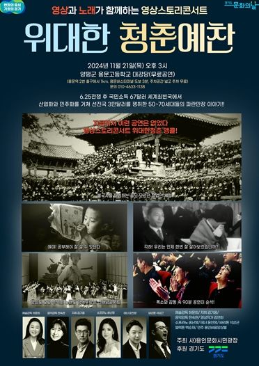 (중부시사신문) 대한민국의 산업화와 민주화 여정을 되돌아보며 그 과정에서 헌신한 선배 세대들의 청춘을 기리는 ‘위대한 청춘예찬’ 영상스토리콘서트가 오는 11월 21일 오후 3시 양평 용문고등학교 대강당에서 개최된다.