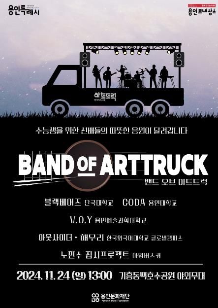 ‘2024 밴드 오브 아트트럭’은 용인문화재단이 운영하고 있는 이동형 무대차량인 ‘아트트럭’의 두 번째 기획 공연으로, 수능을 마친 수험생들을 위한 용인시 관내 대학 선배들의 따뜻한 응원의 무대로 기획되었다.