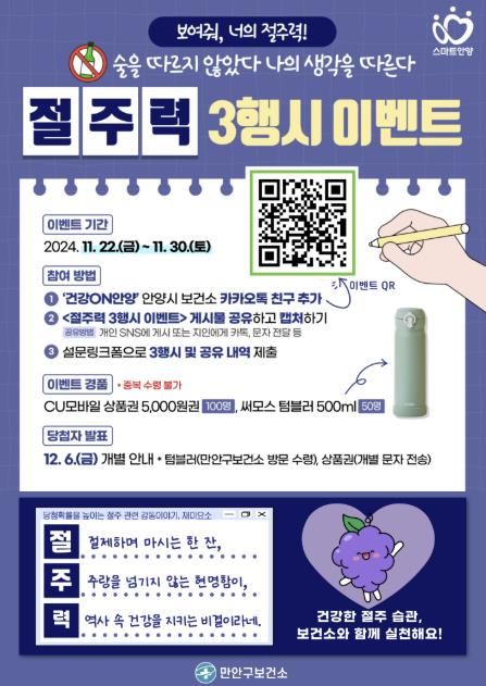 한편, 안양시는 지역사회 캠페인과 더불어 온라인 절주 캠페인도 병행하고 있다. 오는 30일까지 진행되는“절주력 3행시 이벤트”를 통해 시민들이 절주 실천 의지를 다질 수 있도록 독려하고 있으며, 이벤트 참여자에게는 추첨을 통해 모바일쿠폰, 보온텀블러 등 보상품도 제공할 예정이다.
