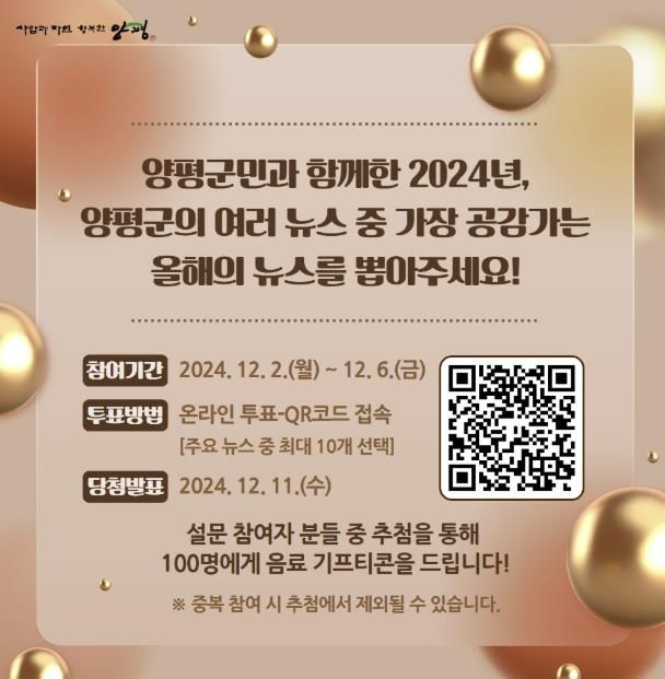 2일부터 6일까지 진행되는 설문은 카카오톡 양평군 채널 ‘양평톡톡’, 문자메시지, 유튜브, 누리 소통망(SNS) 등을 통해 배포된 온라인 접속 주소 또는 QR코드를 통해 참여할 수 있으며 1인당 10건의 뉴스를 올해의 뉴스로 투표할 수 있다.