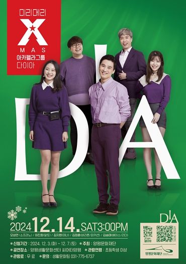 (중부시사신문) 양평문화재단은 12월 14일 토요일 15시, 양평생활문화센터 씨어터양평에서 정기공연 「별빛물빛 콘서트 in 양평」 '미리 메리 X-MAS'를 개최한다. 이는 올해 마지막 공연으로, 아카펠라 그룹 다이아가 무대에 오른다.