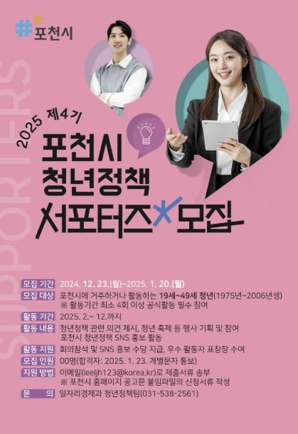 (중부시사신문) 포천시는 오는 2025년 1월 20일까지 ‘2025년 제4기 포천시 청년정책 서포터즈’ 참가자를 모집한다.