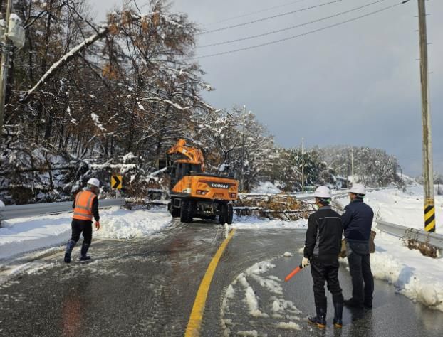 군에 따르면 제설 및 설해 피해목 제거 등 응급 복구에 투입된 장비는 굴착기 등 470대와 인력 600여 명으로, 비용은 4억 7천5백만 원에 달한다.