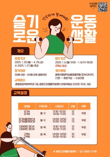 이번 프로그램은 요가, 요가·필라테스, 댄스 다이어트, 근력운동 등 4가지 종목으로 구성되며, 2025년 1월 20일부터 4월 25일까지 주 2회, 약 3개월간 진행된다.