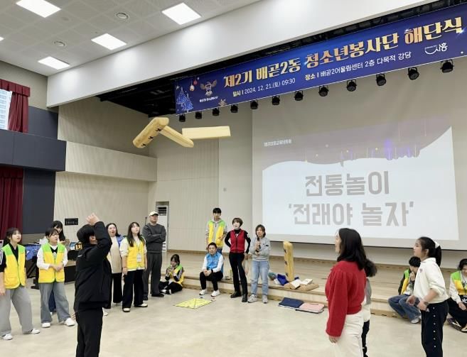 이번 해단식에는 청소년지도위원, 관계 단체장, 청소년봉사단원 가족 등 약 60명이 참석했다. 21명의 봉사단원은 수료장을 수여받고, 그동안의 활동을 되돌아보는 시간을 가졌다. 또한, 해단식 후에는 배곧마을교육자치회 주관으로 전통놀이 ‘전래야 놀자’가 진행돼 봉사단원들과 가족들이 함께 뜻깊은 시간을 보냈다.