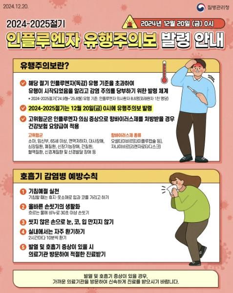 4주간 인플루엔자 (의사)환자 발생이 지속 증가해 50주차(12.8.~14.)에 표본감시기관 외래환자 1천명 당 13.6명이 신고되면서 이번 절기 인플루엔자 유행기준(8.6명)을 초과했다.