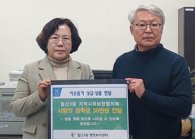 권위향 동장은 “철산3동 지역사회보장협의체는 올해도 지역 복지 향상을 위해 노력했다”며 “이번 장학금 기부는 위원들과 지역사회가 함께 이룬 의미 있는 성과로, 학생들에게 응원과 격려의 마음이 잘 전달되길 바란다”고 전했다.