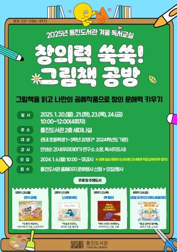 (중부시사신문) 김포시 통진도서관은 2025년 겨울 독서교실 ‘창의력 쑥쑥! 그림책 공방’을 오는 2025년 1월 20일 월요일부터 24일 금요일(22일 수요일 휴관일 제외) 10시에서 12시까지 통진도서관 2층 세미나실에서 운영한다.