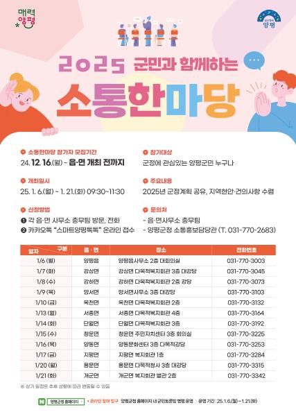 이번 소통한마당은 6일 양평읍을 시작으로 22일 단월면까지 12일간 읍·면을 방문하여 진행될 예정으로, 2025년 민선8기 군정 운영 방향과 주요사업 설명, 주민과의 대화를 통한 건의사항과 정책 제안 청취 등 양방향 소통의 장이 펼쳐진다.