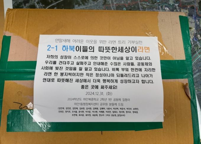 한편, 하안북중 학생들은 작년 초에도 라면을 모아 기부하며 지역 주민을 위한 나눔 활동을 이어오고 있다.
