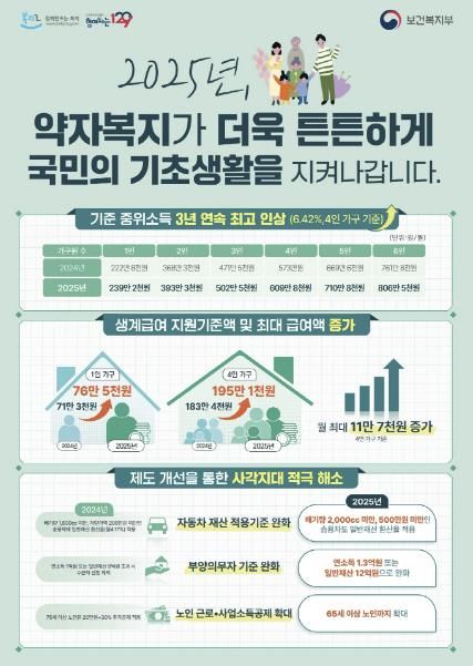 2025년 기준중위소득은 맞춤형 급여체제로 전환된 2015년 이후 역대 최대 증가율을 보였다. 4인 가구 기준으로 지난해 572만 9913원 대비 6.42% 인상된 609만 7,773원, 생계·의료·주거·교육 급여를 포함한 전체 수급가구의 약 74%를 차지하는 1인 가구 기준은 작년 222만 8,445원 대비 7.34% 인상된 239만 2,013원으로 결정됐다.