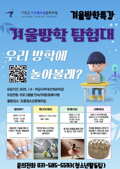 (중부시사신문) 가평군 조종청소년문화의집은 2025년 겨울방학을 맞아 청소년 대상 특강 프로그램인 ‘겨울방학탐험대’를 운영한다고 밝혔다.