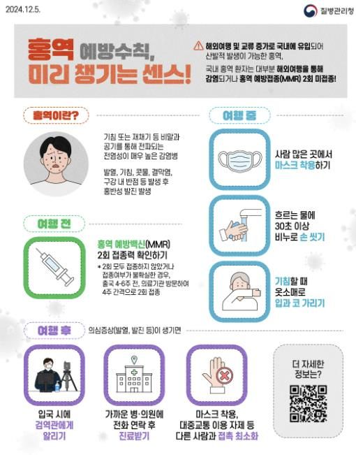 여행 중에는 손 씻기와 마스크 착용 등 개인위생을 철저히 하고, 입국 시 또는 여행 후 발열 등의 홍역 의심 증상이 나타난다면 검역관이나 의료기관에 방문하여 치료받아야 한다.