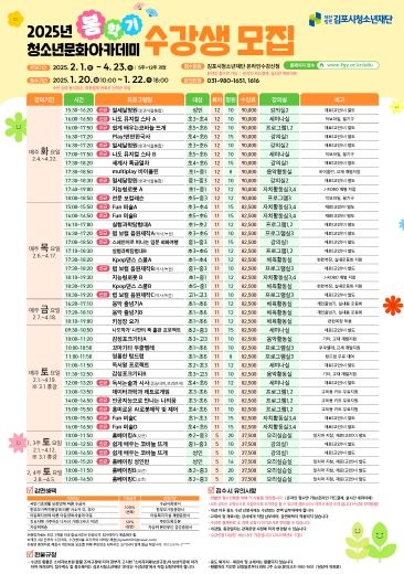(중부시사신문) (재)김포시청소년재단 김포중봉청소년수련관은 관내 청소년의 미래변화 대응력 향상과 성인들의 교양 활동 제공을 위한 ‘문화 아카데미’의 봄학기 수강생을 오는 1월 20일부터 22일까지 3일간 모집한다.