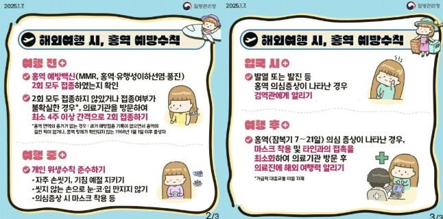 또 여행 후에는 다음과 같은 예방수칙을 준수하여야 한다. ▲입국 시 발열, 발진 등 증상이 있다면 검역관에게 신고해야 하고 ▲도착 후 홍역(잠복기7~21일) 의심 증상(발열 또는 발진 등)이 나타날 경우 마스크 착용 후 의료기관을 방문하여 의료진에게 해외 여행력을 알린 후 진료를 받아야 한다.