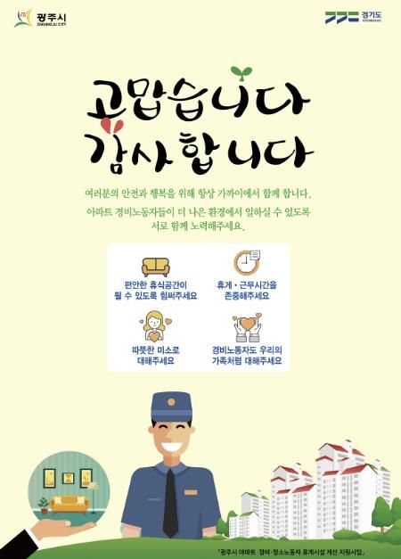 이와 관련 방세환 시장은 “이번 지원사업이 경비·청소 노동자들의 근무 환경을 개선하는 데 그치지 않고 입주민의 인식 변화를 통해 사람 중심의 공동주택 문화를 조성하는 계기가 되길 바란다”고 말했다.