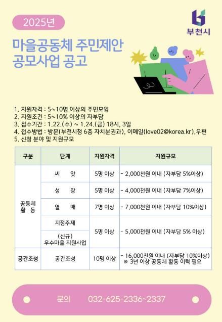 (중부시사신문) 부천시는‘2025년 마을공동체 주민제안 공모사업’에 참여할 공동체를 오는 1월 22일부터 24일까지 모집한다.