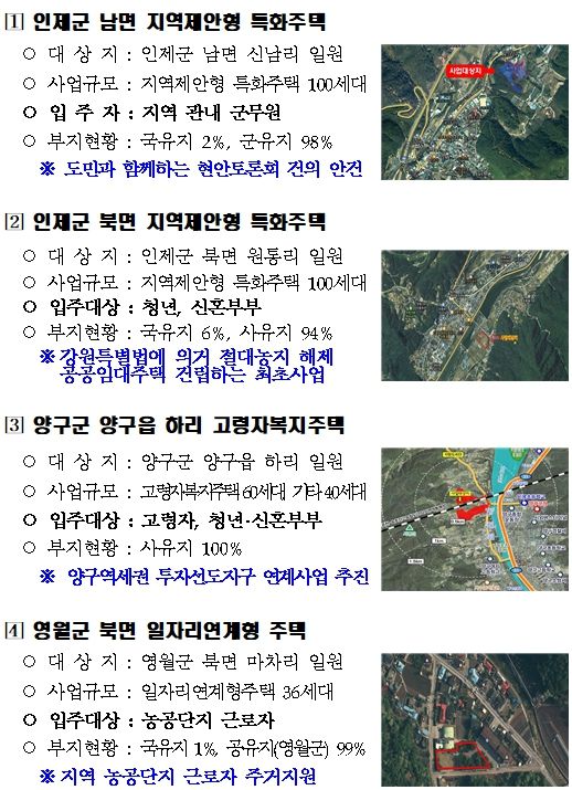 이번 공모에서 인제군(남면·북면)은 지역제안형 특화주택, 양구군은 고령자복지주택, 영월군은 일자리 연계형 주택으로 각각 선정됐다.