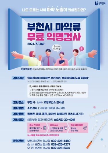 (중부시사신문) 부천시는 타인으로 인해 마약류 노출이 의심되는 시민을 위하여 보건소에서‘마약류 6종 익명 검사’를 제공한다고 밝혔다.