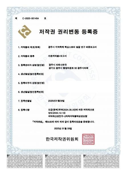 (중부시사신문) '광주시 축제발전 연구회'에서 전국 지방의회 최초로 축제 핵심스토리를 자체 개발해 지난 9일 저작권 등록을 마쳐 이목이 집중되고 있다.