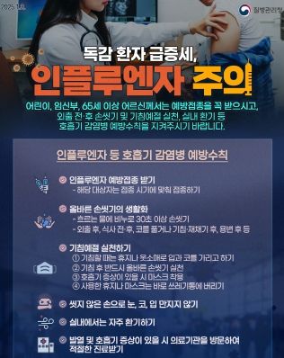 인플루엔자 감염은 전국 1월 1주차(12월29~1월4일) 표본 감시 결과 1,000명 당 99.8명으로 2016년 이래 최고 수준으로 발생하고 있어 65세 이상, 어린이, 면역저하자 등에게 신속한 백신접종이 필요하다.