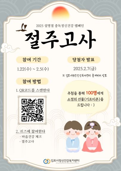 1월 22일부터 2월 5일까지 진행되는 이번 캠페인은 김포시민 누구나 참여할 수 있다. 방법은 포스터 내 QR코드를 스캔해여 간편하게 참여할 수 있으며, 참여자 중 추첨을 통해 소정의 상품도 제공될 예정이다.