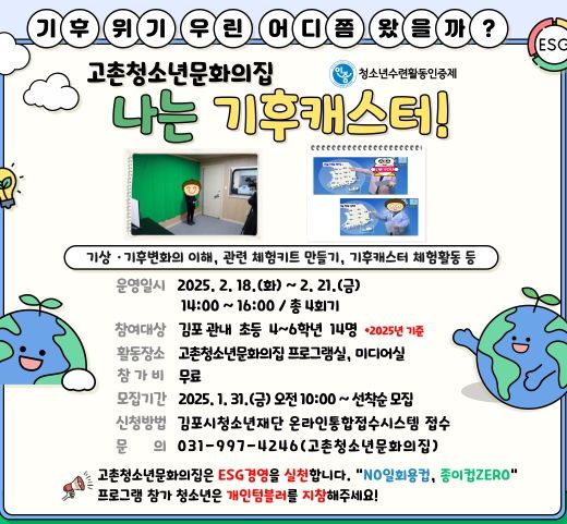 (중부시사신문) 김포시청소년재단 고촌청소년문화의집은 2월 18일부터 21일까지 4일간 청소년수련활동인증 제10096호 ‘나는 기후캐스터!’ 프로그램을 운영한다.