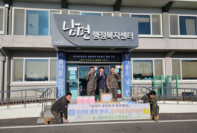 (중부시사신문) 양주시 남면이 최근 제28보병사단 공병대대가 설 명절을 앞두고 남면 행정복지센터를 방문해 저소득 참전유공자 가정을 위해 60만원 상당의 위문품을 전달했다고 31일 밝혔다.