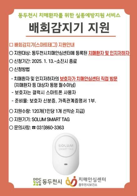 이에 동두천시 치매안심센터에서는 실종 노인의 조속한 발견과 안전한 복귀를 지원하기 위해 치매환자 및 인지저하자를 대상으로 배회감지기를 무료로 지원하기로 했다.