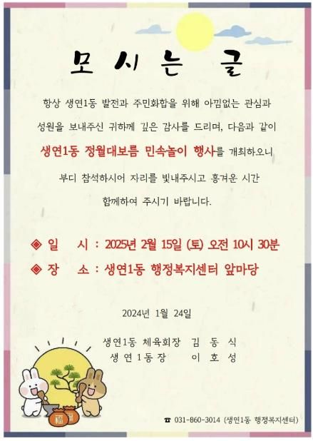 (중부시사신문) 생연1동 체육회는 오는 2월 15일, 생연1동 행정복지센터 앞마당에서 『2025년 생연1동 정월대보름 민속놀이 행사』를 개최한다고 전했다.