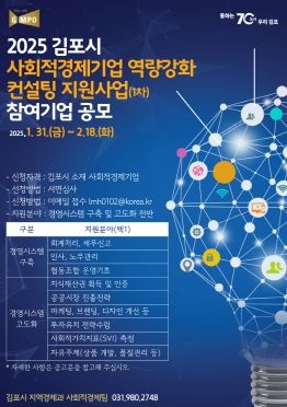 (중부시사신문) 김포시는 사회적경제기업의 지속 가능한 성장을 위해 '2025년 사회적경제기업 역량 강화 컨설팅 지원사업'에 참여할 기업을 2월 18일까지 모집한다.