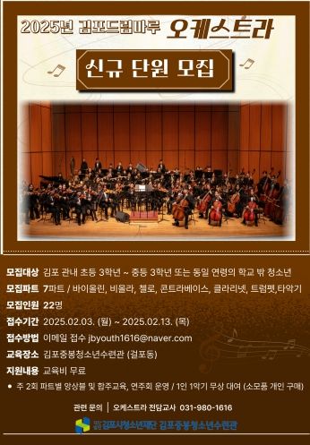 (중부시사신문) (재)김포시청소년재단 김포중봉청소년수련관에서 김포드림마루 오케스트라 13기 신규 단원을 모집한다. 모집 일정은 2월 3일부터 13일까지이며, 총 7개 파트에서 청소년 22명을 모집한다.