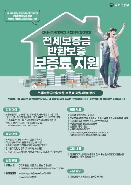‘전세보증금 반환보증 보증료 지원사업’은 임차인의 전세보증금 미반환 피해를 막고자 보증보험 가입비용을 지원하는 사업으로, 임차인이 임대차 계약 후 보증보험 가입에 납부한 보증료를 최대 30만 원까지 지원한다.