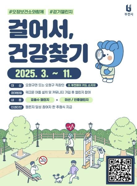 (중부시사신문) 부천시 오정보건소는 오는 3월부터 11월까지 부천페이 카드를 소지한 오정구민을 대상으로 걷기 챌린지‘걸어서, 건강 찾기’를 운영한다.