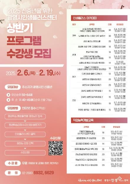 (중부시사신문) 광명시 인생플러스센터는 6일부터 이달 19일까지 신중년의 인생2막을 지원하기 위해 2025년 상반기 프로그램 수강생을 모집한다.