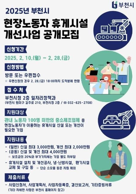 (중부시사신문) 부천시는 관내 휴게 여건이 열악한 중소제조업체 현장 노동자의 휴식 환경 개선을 위해 실시하는 ‘2025년 현장노동자 휴게시설 개선사업’ 참여 기업을 오는 2월 10일부터 28일까지 모집한다고 밝혔다.