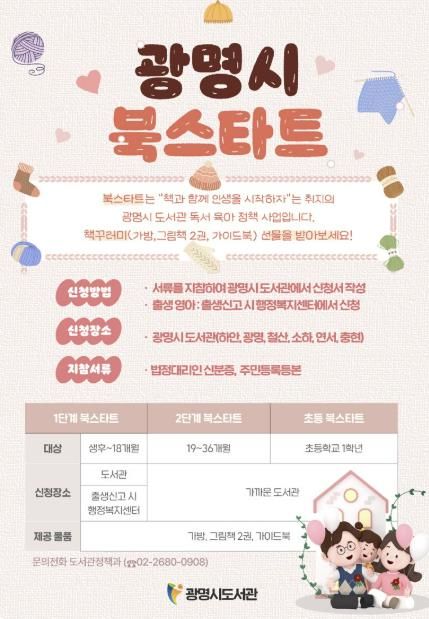 광명시에 거주하며 36개월 이하 영유아나 초등학교 1학년생을 키우는 부모는 하안·광명·철산·소하·연서·충현 도서관에 방문해 신청할 수 있다.