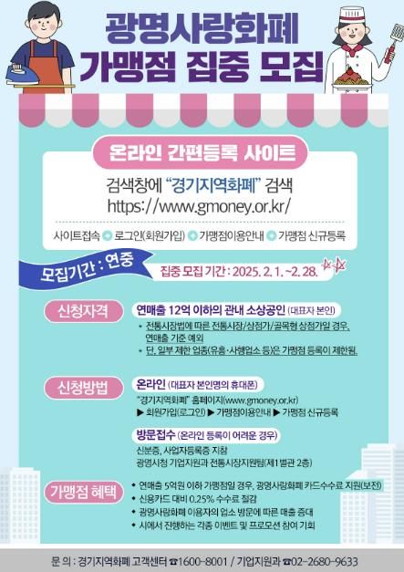 가맹점 등록은 경기지역화폐 홈페이지에서 온라인으로 신청하거나 광명시청 기업지원과를 방문해 신청할 수 있다.