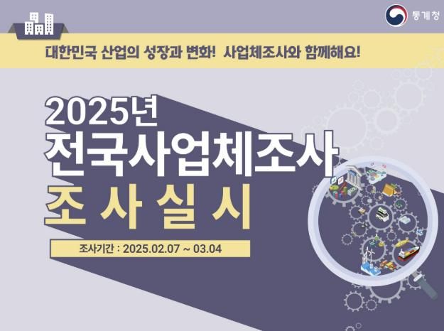 사업체조사는 매년 전국적으로 실시되는 국가 지정 통계조사로, 전국 모든 사업체의 지역별 분포 및 고용구조를 파악해 각종 정부 정책수립·평가, 기업 경영계획 수립 및 학술연구 기초자료로 활용한다.