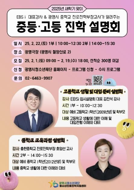 (중부시사신문) 광명시청소년재단 청소년진로진학지원센터는 2025학년도 새학기를 앞두고 2월 22일 토요일 광명극장에서 ‘예비 중학생 및 예비 고등학생을 위한 진학 설명회’를 개최한다고 밝혔다.