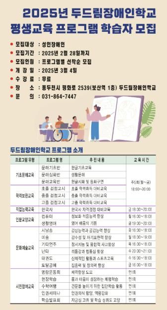 (중부시사신문) 동두천시는 장애인 평생교육 진흥을 위해 지원하고 있는 두드림장애인학교가 2025학년도 평생교육 프로그램 학습자를 모집한다고 전했다.