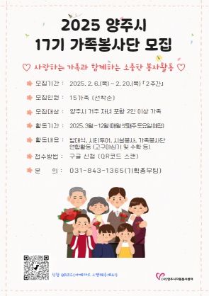 (중부시사신문) 사)양주시자원봉사센터는 가족과 함께 건강한 가족문화를 만들고 지역사회에 긍정적인 변화를 이끌어낼 “제17기 양주시 가족봉사단”을 모집한다고 10일 밝혔다.
