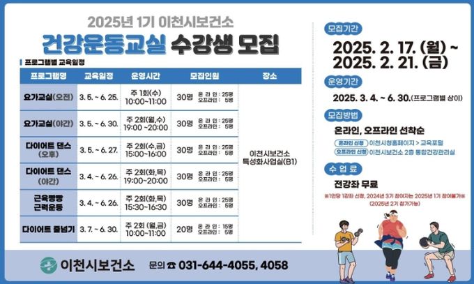 (중부시사신문) 이천시보건소는 시민들이 건강생활을 실천할 수 있도록 ‘2025년 1기 건강운동교실’ 참여자를 선착순으로 모집한다고 전했다..